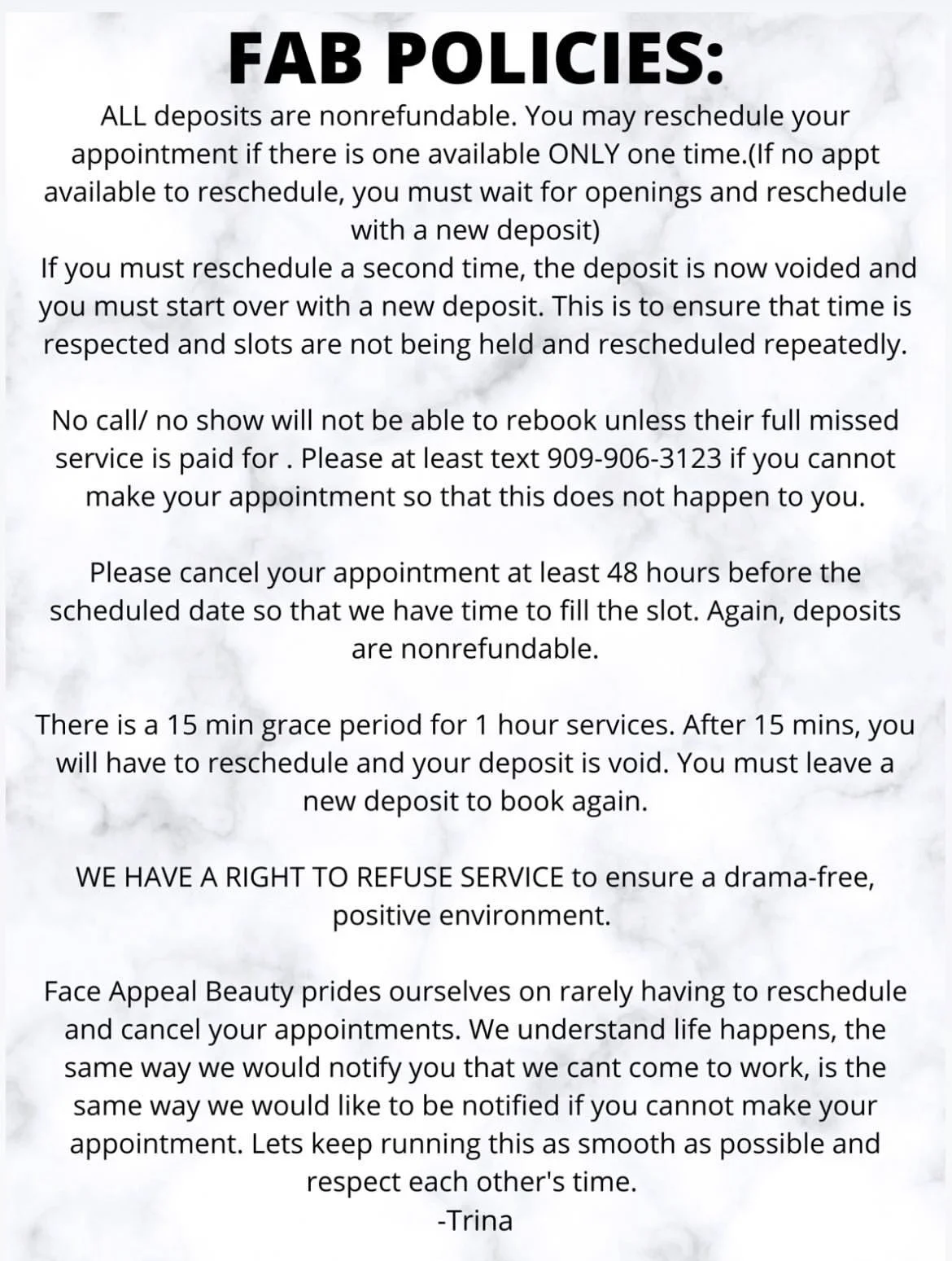 ALL appointment deposits are NONREFUNDABLE. Rescheduling can be done online BEFORE the 48 hour cut off time. If there are no reschedule dates available, you must still cancel your appointment so that it is open for someone else to book, and leave a deposit for the next appointment you book (will go toward your service).